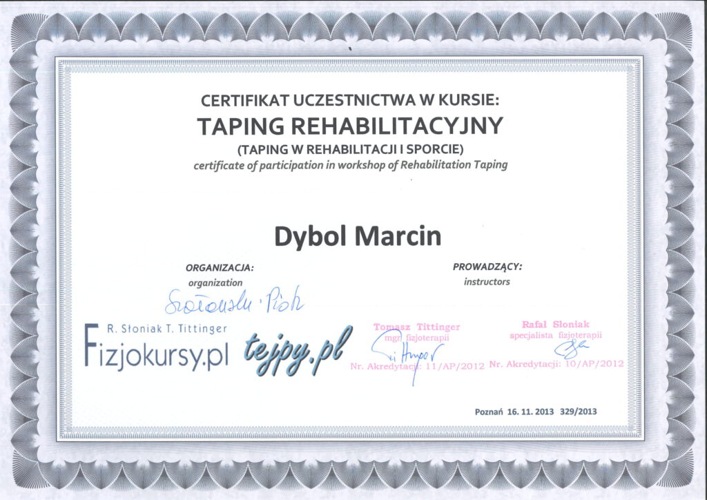 - 2014: Kurs podstawowy koncepcji PNF Proprioceptive Neuromuscular Facilitation. Attila Szabo;