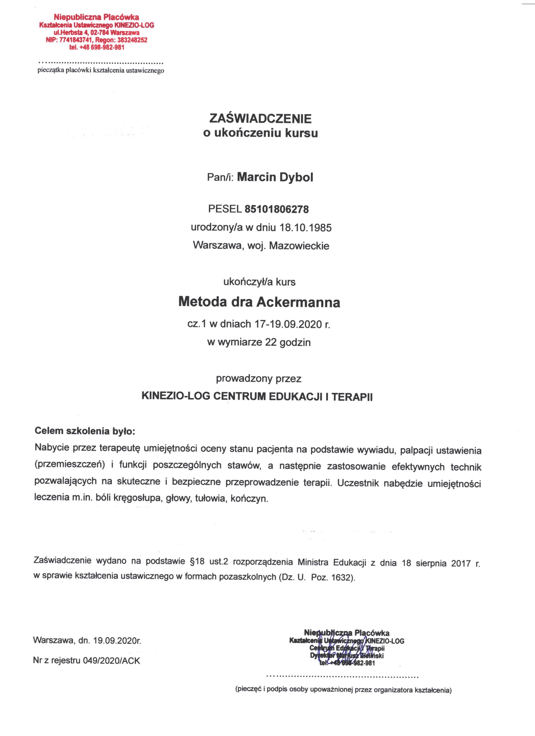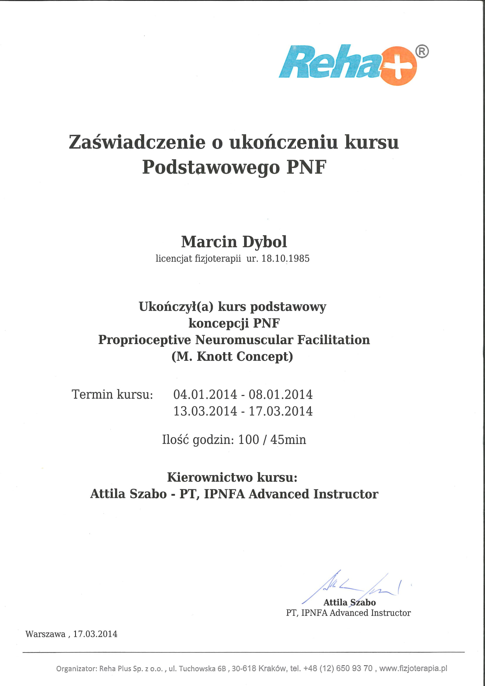 - 2014: Kurs podstawowy koncepcji PNF Proprioceptive Neuromuscular Facilitation. Attila Szabo;